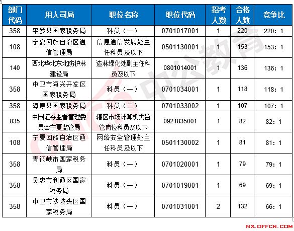 截止到20日16時(shí),競(jìng)爭(zhēng)比例的職位為平羅縣國(guó)家稅務(wù)局科員(一)一職,招錄1人,截止到20日16時(shí)合格人數(shù)為220人,具體信息如下: