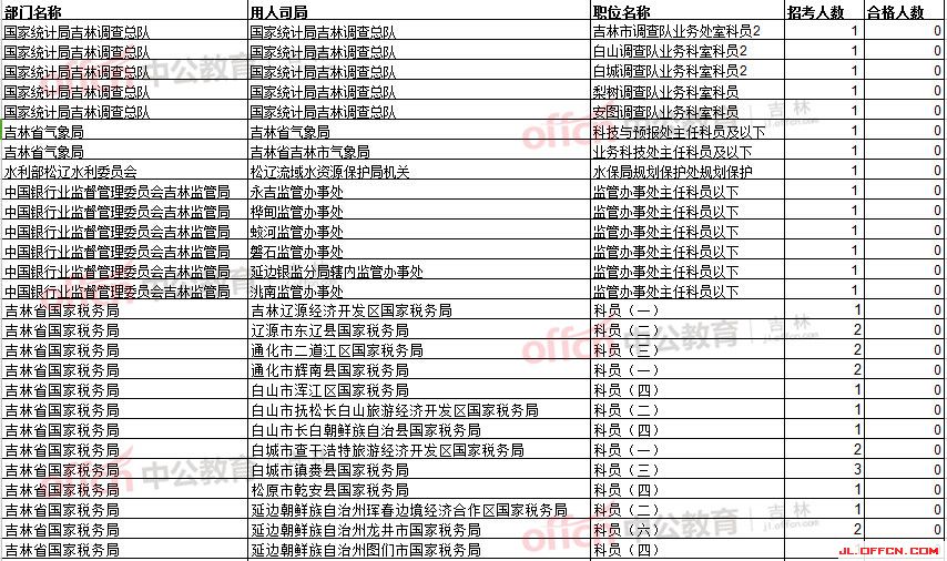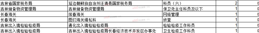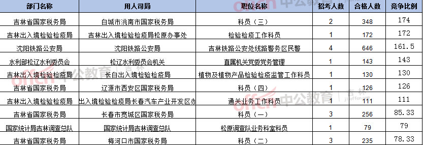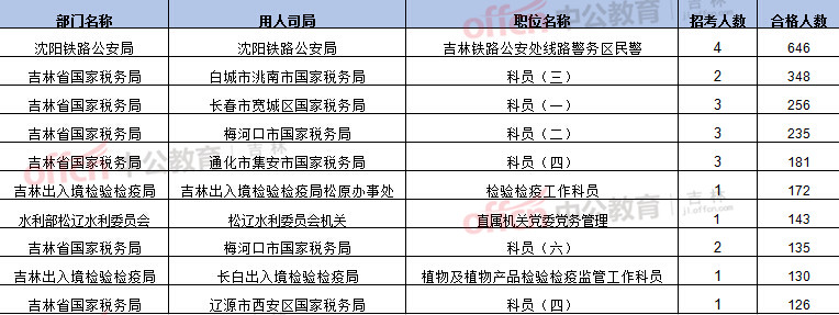 報名通過審核人數(shù)前十的職位主要集中在吉林省國稅局和吉林出入境檢驗檢疫局,具體信息如下: