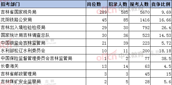 截止到20日16時,競爭比例的職位為吉林鐵路公安處線路警務(wù)區(qū)民警一職,招錄4人,截止到20日16時通過人數(shù)為646人。其次為吉林省國稅局部門。