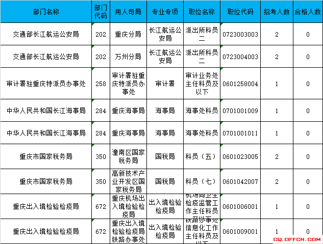 截止到20日16時(shí),工作地點(diǎn)在重慶的職位共有9個(gè)無人報(bào)考,占全部職位的3%。下面是無人報(bào)考職位一覽表,中公教育專家建議廣大考生多關(guān)注一些較冷職位,避免激烈競(jìng)爭(zhēng),結(jié)合自身?xiàng)l件,找到屬于自己的職位。