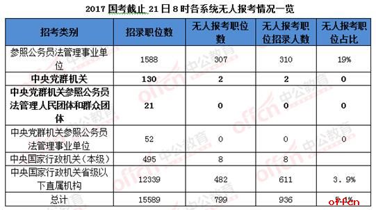 截止到21日8時,共有14790個職位有考生通過審核,占總職位數的94.9%,目前仍有799個崗位報考人數還未破零,占5.1%。從各系統(tǒng)無人報考情況看,目前“中央黨群機關參照公務員管理法管理事業(yè)單位”及“中央黨群機關參照公務員法管理人民團體和群眾團體”系統(tǒng)所有職位已經全部有人過審。