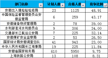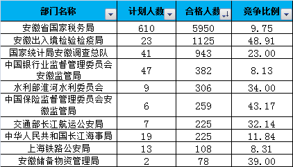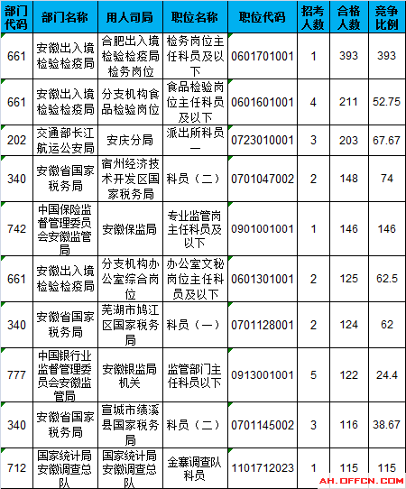 報(bào)名通過(guò)審核人數(shù)前十的職位主要集中在安徽出入境檢驗(yàn)檢疫局、交通部長(zhǎng)江航運(yùn)公安局、安徽省國(guó)家稅務(wù)局等部門(mén),具體信息如下:
