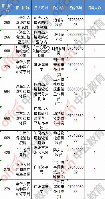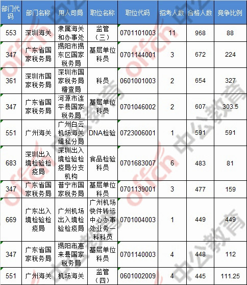 報名通過審核人數(shù)前十的職位主要集中在深圳海關(guān)、廣東省國家稅務(wù)局、深圳市國家稅務(wù)局,具體信息如下: