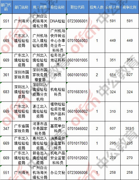 截止到21日8時,競爭比例的職位為廣州海關(guān)廣州白云機場海關(guān)緝私分局DNA檢驗一職,招錄1人,截止到21日8時通過人數(shù)為591人。