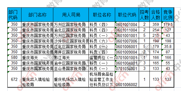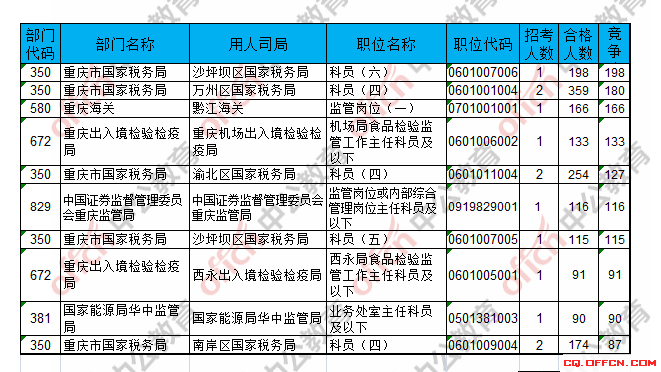 報名通過審核人數(shù)前十的職位主要集中在萬州區(qū)國家稅務局、渝北區(qū)國家稅務局、沙坪壩區(qū)國家稅務局等部門,具體信息如下: