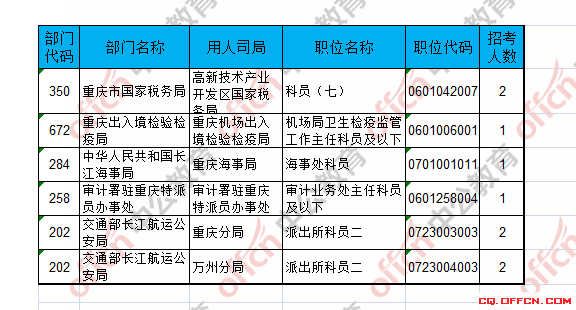 截止到21日8時,工作地點在重慶的職位共有6個無人報考,占全部職位的2%。下面是無人報考職位一覽表,中公網(wǎng)校專家建議廣大考生多關(guān)注一些較冷職位,避免激烈競爭,結(jié)合自身條件,找到屬于自己的職位。