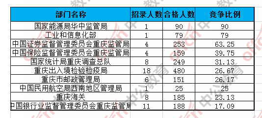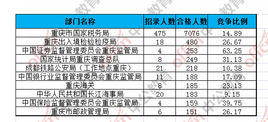為幫助廣大考生更清晰的了解今日報名情況,重慶中公網(wǎng)校整理了審核通過人數(shù)前十位的部門以及競爭比例最激烈的十大部門,供廣大考生參考: