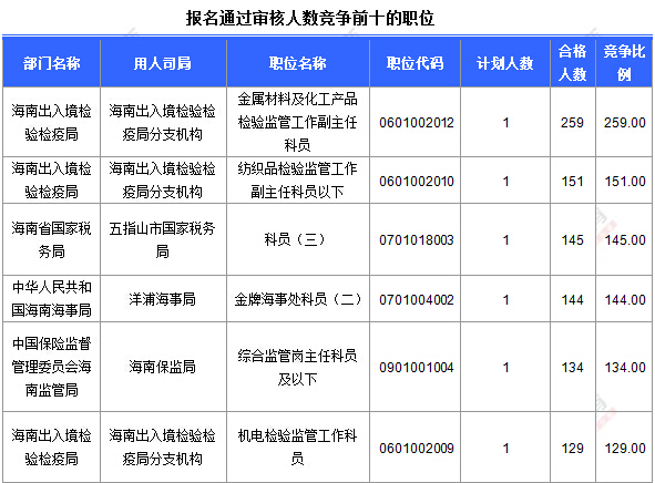 截止到21日8時(shí),仍有13個(gè)職位無人報(bào)名,而熱門職位競(jìng)爭(zhēng)卻是越來越激烈,其中報(bào)名人數(shù)最多的職位為:海南出入境檢驗(yàn)檢疫局,金屬材料及化工產(chǎn)品檢驗(yàn)監(jiān)管工作副主任科員,共報(bào)名259人,競(jìng)爭(zhēng)比例已高達(dá)259:1!