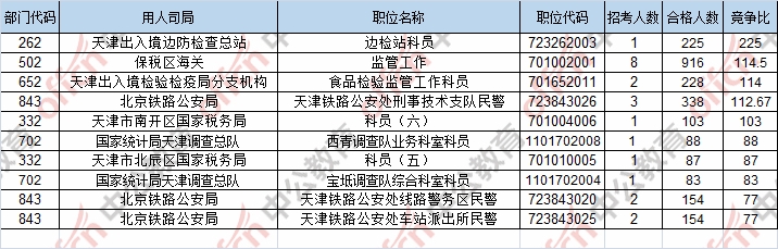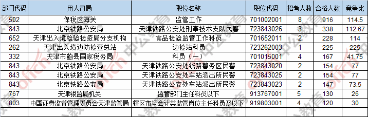 報名通過審核人數(shù)前十的職位主要集中在保稅區(qū)海關、北京鐵路公安局、天津出入境檢驗檢疫局分支機構,具體信息如下:
