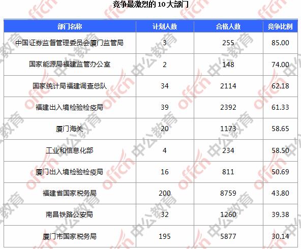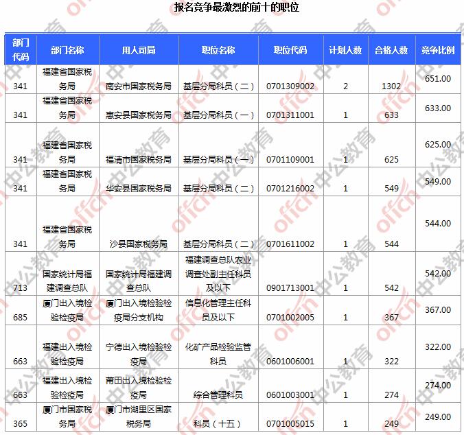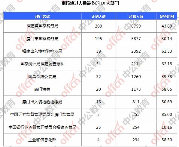 為幫助廣大考生更清晰的了解今日報(bào)名情況,福建中公網(wǎng)校整理了審核通過人數(shù)前10位的部門以及競爭比例最激烈的10大部門,供廣大考生參考: