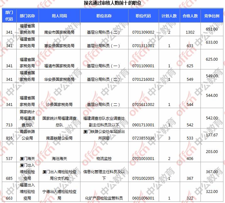 報(bào)名通過審核人數(shù)前十的職位主要集中在南安市國家稅務(wù)局、惠安縣國家稅務(wù)局、福清市國家稅務(wù)局等部門,具體信息如下: