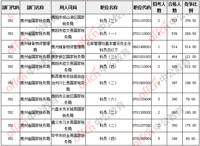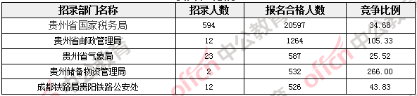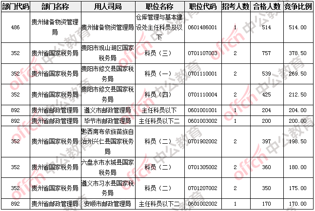 報(bào)名通過審核人數(shù)較多的職位主要集中在貴州省國家稅務(wù)局、貴州儲備物資管理局兩大部門,具體信息如下: