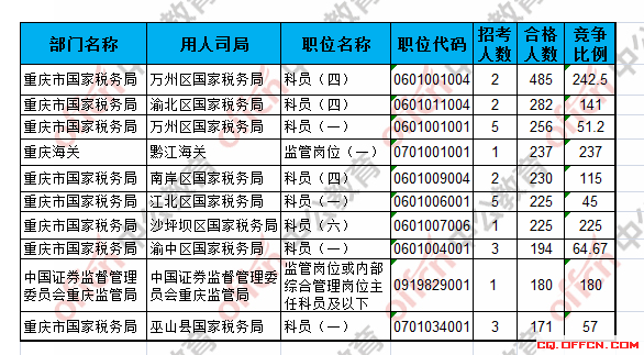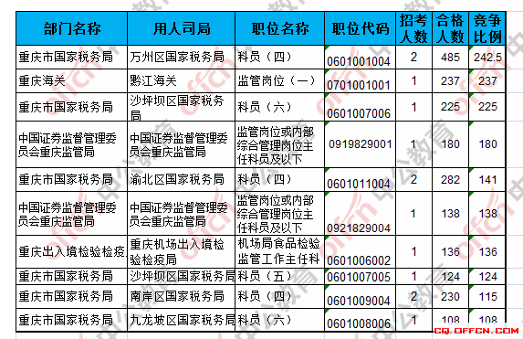 報(bào)名通過審核人數(shù)前十的職位主要集中在萬州區(qū)國(guó)家稅務(wù)局、渝北區(qū)國(guó)家稅務(wù)局、黔江海關(guān)等部門,具體信息如下: