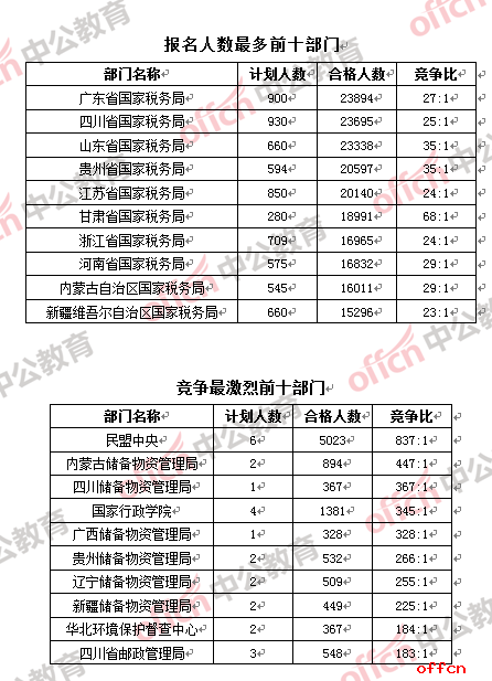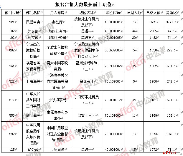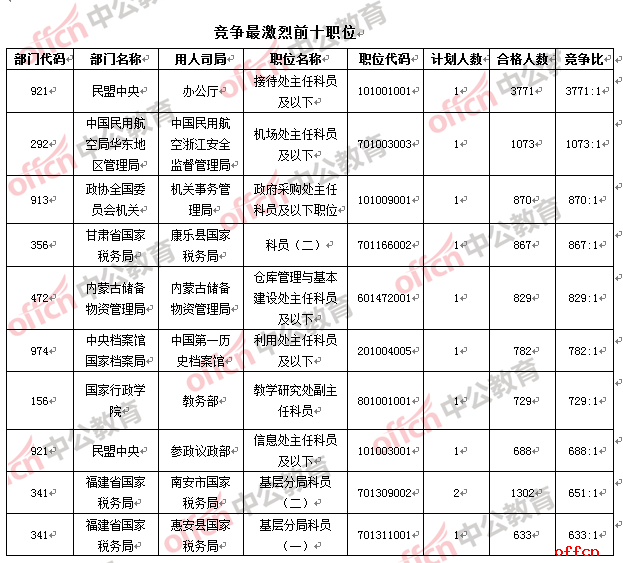 與去年同期競爭最激烈部門的584:1相比,今年的民盟中央的競爭比達(dá)到837:1,成為今年競爭比“破八百”的部門,遠(yuǎn)拋與排名第二內(nèi)蒙古物管局的447:1。在競爭最激烈的前十部門中,物管局站席6個,物管局成為眾多考生未來職業(yè)發(fā)展的“理想之所”。