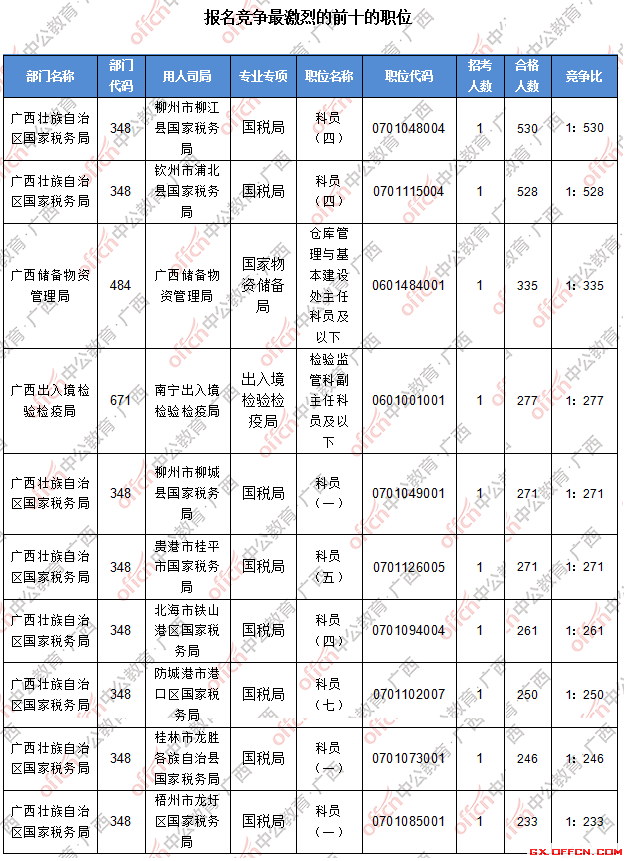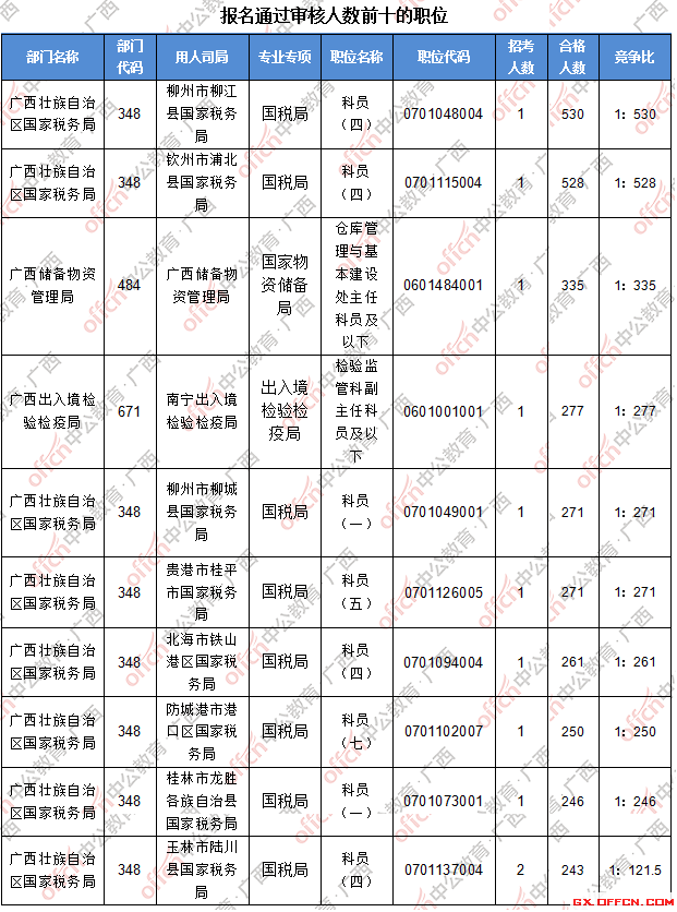 報(bào)名通過審核人數(shù)前十的職位主要集中在廣西壯族自治區(qū)國家稅務(wù)局、廣西儲(chǔ)備物資管理局、廣西出入境檢驗(yàn)檢疫局等部門,具體信息如下:
