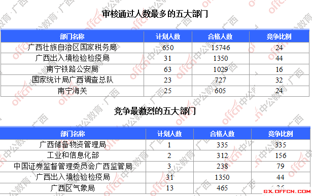 為幫助廣大考生更清晰的了解今日報(bào)名情況,廣西中公教育整理了審核通過人數(shù)前五位的部門以及競爭比例最激烈的五大部門,供廣大考生參考: