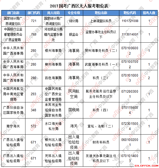 截止到22日8時(shí),工作地點(diǎn)在廣西的職位共有10個(gè)無人報(bào)考,僅占全部職位的1.6%。下面是部分廣西無人報(bào)考職位一覽表,廣西中公教育專家建議廣大考生結(jié)合自身?xiàng)l件,根據(jù)自己的實(shí)際情況找到屬于自己的職位,避免激烈競爭。