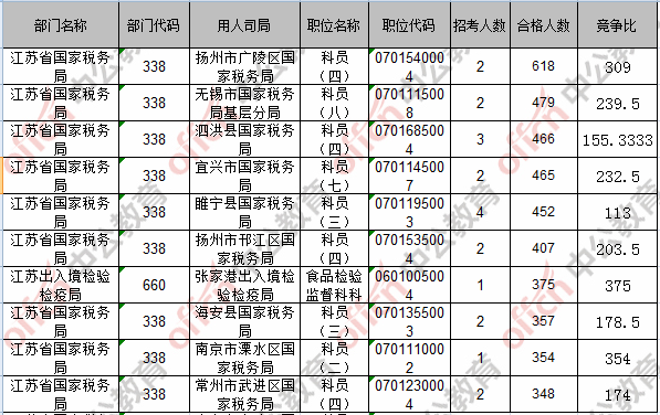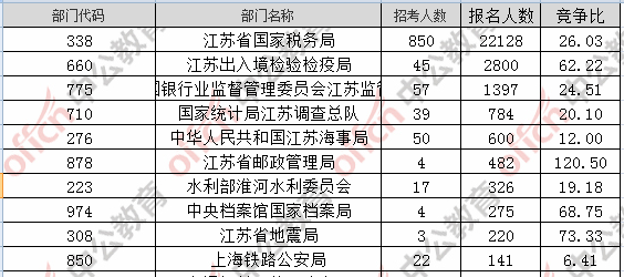 報(bào)名通過(guò)審核人數(shù)前十的職位主要集中在江蘇省國(guó)家稅務(wù)局、江蘇出入境檢驗(yàn)檢疫局,具體信息如下: