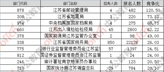 為幫助廣大考生更清晰的了解今日?qǐng)?bào)名情況,江蘇中公教育整理了審核通過(guò)人數(shù)前十位的部門以及競(jìng)爭(zhēng)比例最激烈的十大部門,供廣大考生參考: