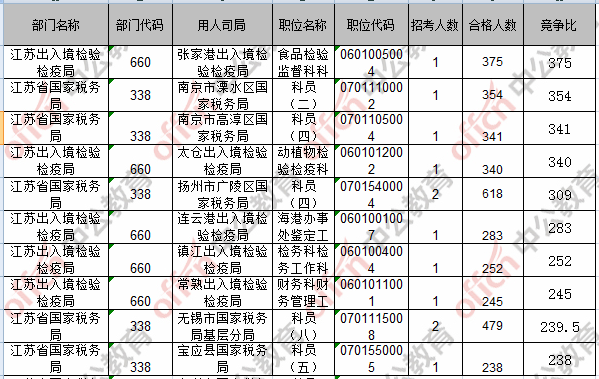 截至22日8時(shí),競(jìng)爭(zhēng)比例的職位為江蘇出入境檢驗(yàn)檢疫局張家港出入境檢驗(yàn)檢疫局食品檢驗(yàn)監(jiān)督科科員一職,招錄1人,截至22日8時(shí)通過(guò)人數(shù)為375人。