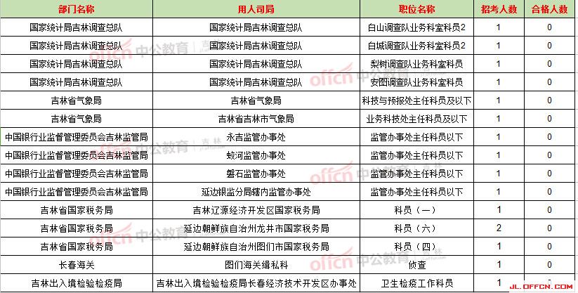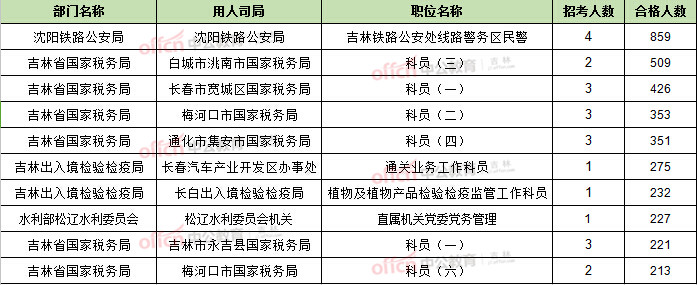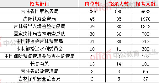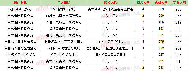 報(bào)名通過(guò)審核人數(shù)前十的職位主要集中在吉林省國(guó)稅局和吉林出入境檢驗(yàn)檢疫局,具體信息如下: