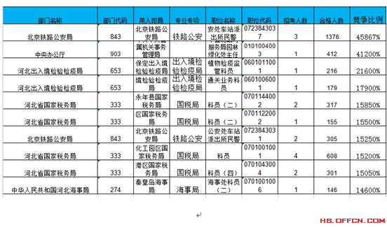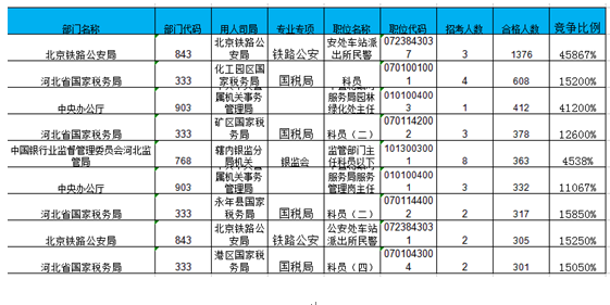 報(bào)名通過審核人數(shù)前十的職位主要集中在北京鐵路公安局、河北省國家稅務(wù)局、中央辦公廳等部門,具體信息如下:
