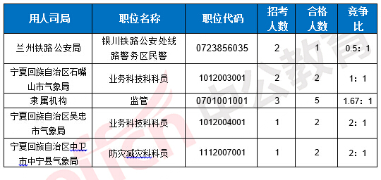 截止到22日16時(shí),工作地點(diǎn)在寧夏的職位均有人報(bào)考,其中5職位競(jìng)爭(zhēng)比低于面試比例。下面是爭(zhēng)比例低于面試比例職位一覽表,中公教育專家建議廣大考生多關(guān)注一些較冷職位,避免激烈競(jìng)爭(zhēng),結(jié)合自身?xiàng)l件,找到屬于自己的職位。