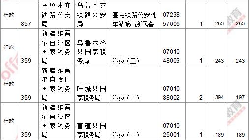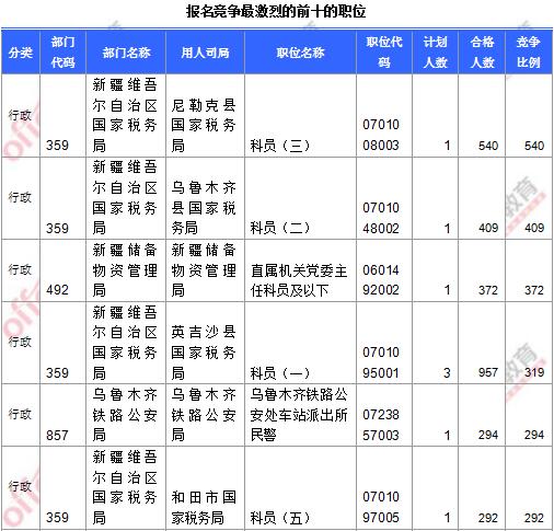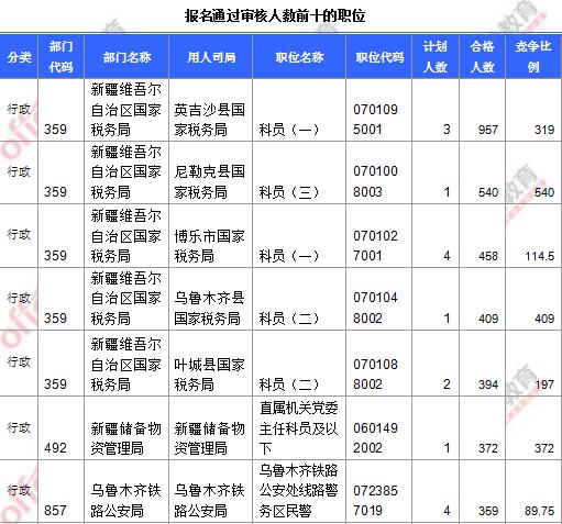 報(bào)名通過審核人數(shù)前十的職位主要集中在新疆維吾爾自治區(qū)國家稅務(wù)局、新疆儲備物資管理局、烏魯木齊鐵路公安局部門,具體信息如下: