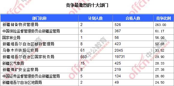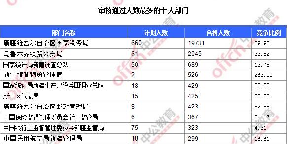 為幫助廣大考生更清晰的了解今日報(bào)名情況,新疆中公教育整理了審核通過人數(shù)前十位的部門以及競爭比例最激烈的十大部門,供廣大考生參考: