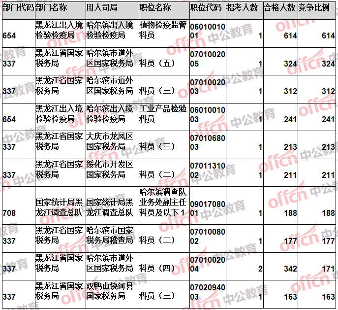 截止到22日16時(shí),競(jìng)爭(zhēng)比例的職位為黑龍江出入境檢驗(yàn)檢疫局哈爾濱出入境檢驗(yàn)檢疫局植物檢疫監(jiān)管科員一職,招錄1人,截止到22日16時(shí)通過(guò)審核人數(shù)為614人。