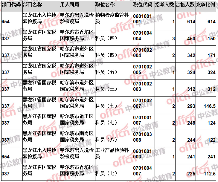 報(bào)名通過(guò)審核人數(shù)前十的職位主要集中在黑龍江省國(guó)家稅務(wù)局、黑龍江出入境檢驗(yàn)檢疫局、哈爾濱鐵路公安局等部門(mén),具體信息如下: