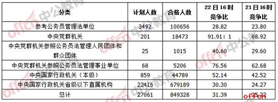 據(jù)中公教育數(shù)據(jù)統(tǒng)計,截至22日16時,經(jīng)過了近8天的報名后,報名系統(tǒng)已經(jīng)審核通過了849328人,超出去年同期5萬人左右,平均競爭比為31.38:1,高出去年同期的28.8:1。從單日增長量來看,較21日下午同期增加了166899人。從各系統(tǒng)來看,中央黨群機關競爭比,已達到91.91:1。目前仍有490個崗位報考人數(shù)還未破零,占3.14%。