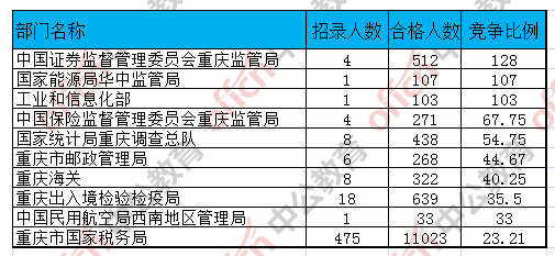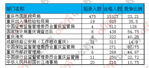 為幫助廣大考生更清晰的了解今日?qǐng)?bào)名情況,重慶中公教育整理了審核通過(guò)人數(shù)前十位的部門(mén)以及競(jìng)爭(zhēng)比例最激烈的十大部門(mén),供廣大考生參考: