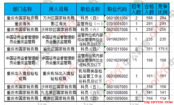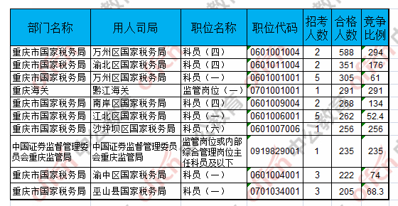 報(bào)名通過(guò)審核人數(shù)前十的職位主要集中在萬(wàn)州區(qū)國(guó)家稅務(wù)局、渝北區(qū)國(guó)家稅務(wù)局、黔江海關(guān)等部門(mén),具體信息如下: