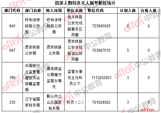 國考招錄面向全國各地,涵蓋各部門、各系統(tǒng),考生出于地域、門檻等因素的考慮會在選擇職位時有所偏向,因此,冷熱不均的局面就產(chǎn)生了。目前仍有438個職位報考人數(shù)還未破零,占總職位數(shù)的2.8%,中央黨群機關(guān)以及中央國家行政機關(guān)(本級)這兩個系統(tǒng)目前都僅剩1個職位無人報考,分別為國家外國專家局經(jīng)濟技術(shù)專家司項目處主任科員及以下(職位代碼407002001),中共中央對外聯(lián)絡部二局蒙古語翻譯(職位代碼102004002),希望符合條件的考生重點考慮以上兩個職位。