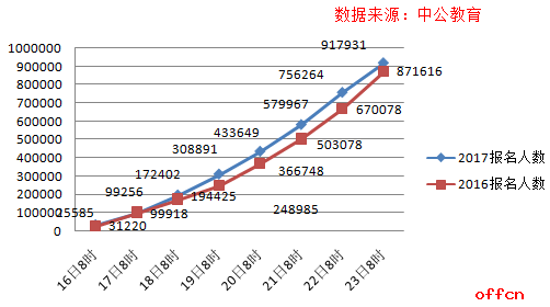 從2016國考報名跟2017國考報名對比走勢圖來看,今年報名總?cè)藬?shù)超去年已成定局,國考熱正在持續(xù)升溫。
