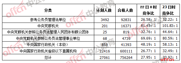 10月23日,2017國家公務員考試報名進入了第九天。據(jù)中公網(wǎng)校數(shù)據(jù)統(tǒng)計,截至23日8時,經(jīng)過了近8天又1夜的報名后,報名系統(tǒng)已經(jīng)審核通過了917931人,遠超去年同期的87.2萬。較昨日同期的數(shù)據(jù)相比,報名合格人數(shù)增加了16萬余人,平均競爭比為33.92:1。民盟中央辦公廳接待處主任科員及以下(職位代碼101001001)這一職位依然最熱職位排行榜,競爭比已高達7032:1,共有21個職位競爭比1000:1。與其熱度相反的是,目前仍有438個崗位報考人數(shù)還未破零,占2%,與去年同期的308個無人報考職位多出130個。中央黨群機關(guān)參照公務員法管理人民團體和群眾團體系統(tǒng)、中央黨群機關(guān)參照公務員法管理事業(yè)單位這兩個系統(tǒng)的所有職位已經(jīng)全部有人過審,報考率達100%。