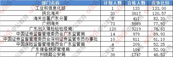 為幫助廣大考生更清晰的了解今日?qǐng)?bào)名情況,廣東中公網(wǎng)校整理了審核通過(guò)人數(shù)前十位的部門(mén)以及競(jìng)爭(zhēng)比例最激烈的十大部門(mén),供廣大考生參考: