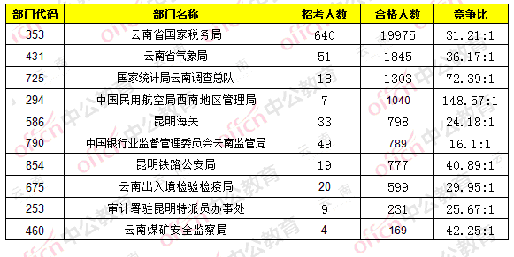 報名通過審核人數(shù)前十的職位主要集中在中國民用航空局西南地區(qū)管理局、云南省國家稅務(wù)局、云南省氣象局等,具體信息如下: