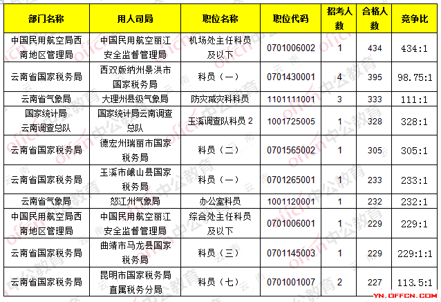 截止23日8時,招錄比例的職位為中國民用航空麗江安全監(jiān)督管理局_機場處主任科員及以下,職位代碼是0701006002,招錄1人,通過人數(shù)434人,競爭比434:1