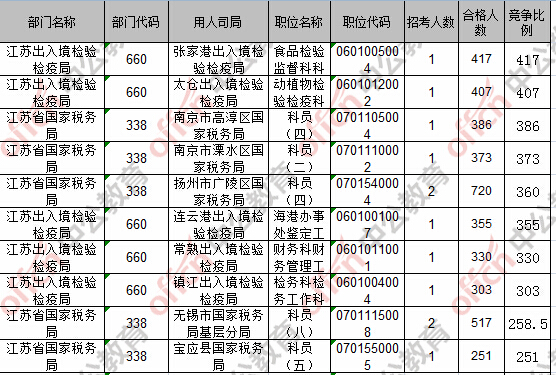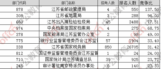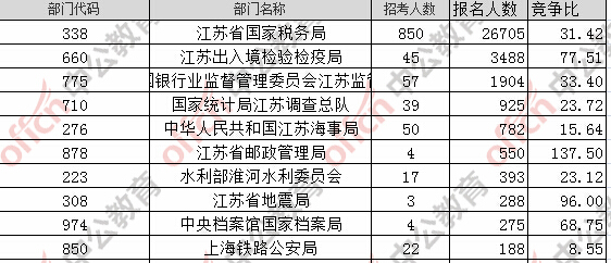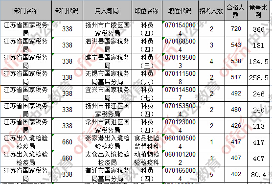 報名通過審核人數(shù)前十的職位主要集中在江蘇省國家稅務局、江蘇出入境檢驗檢疫局,具體信息如下: