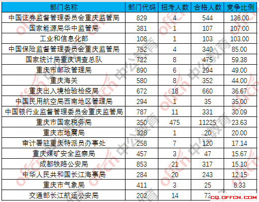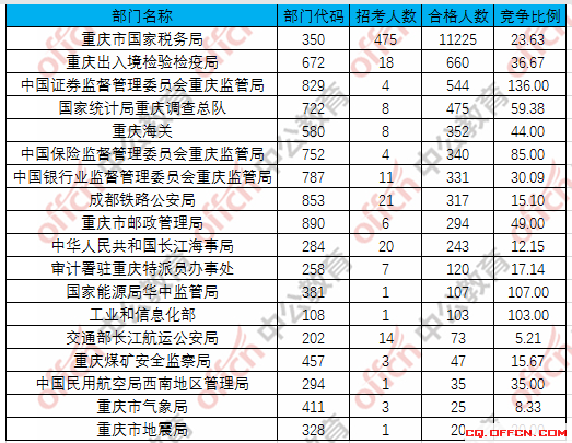 為幫助廣大考生更清晰的了解今日?qǐng)?bào)名情況,重慶中公網(wǎng)校整理了重慶的各個(gè)部門合格人數(shù)以及競爭比例,供廣大考生參考: