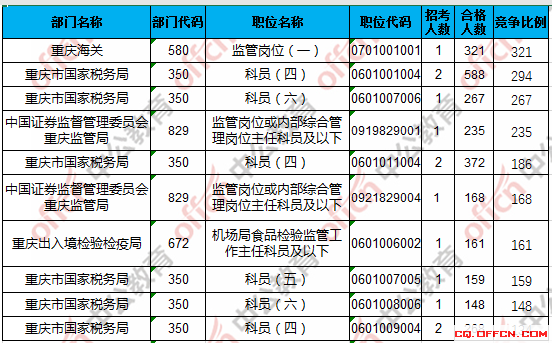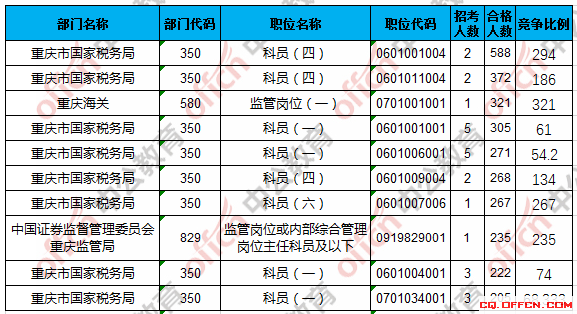 合格人數(shù)前十的職位主要集中在重慶市國家稅務(wù)局、重慶海關(guān)等部門,具體信息如下: