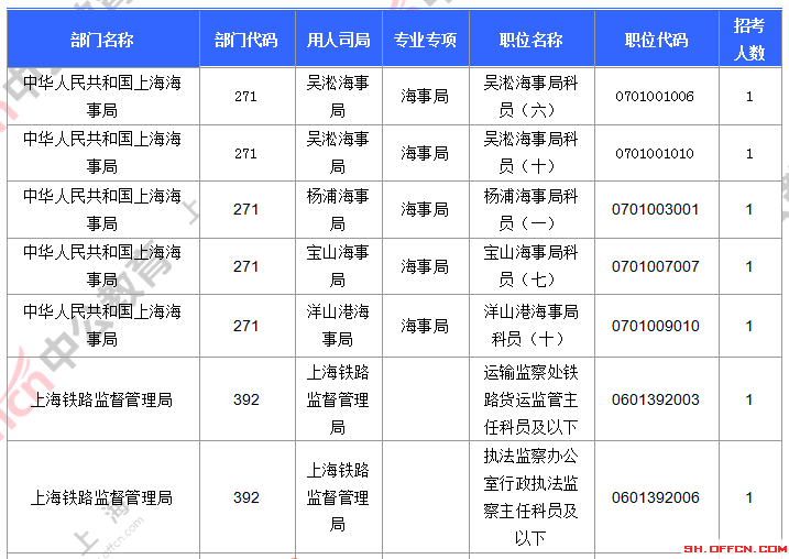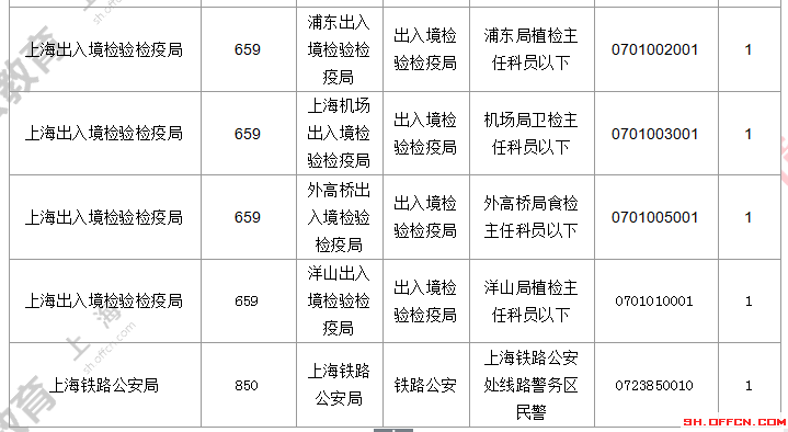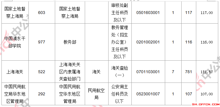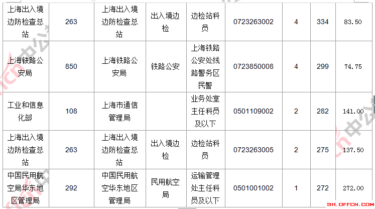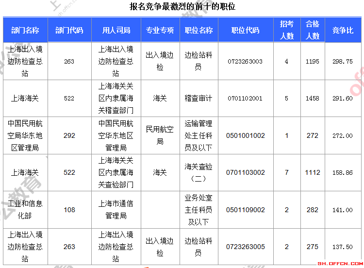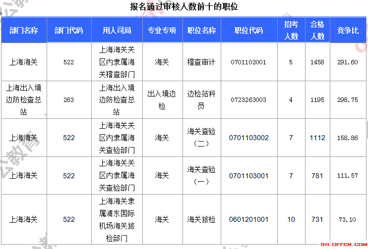 截止到23日8時(shí),競(jìng)爭(zhēng)比例的職位為上海出入境邊防檢查總站邊檢站科員一職,招錄4人,截止到23日8時(shí)通過(guò)人數(shù)為1195人。報(bào)名通過(guò)審核人數(shù)前十的職位主要集中在上海海關(guān)、上海出入境邊防檢查總站、上海鐵路公安局等部門,具體信息如下: