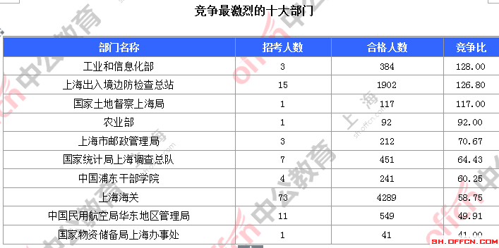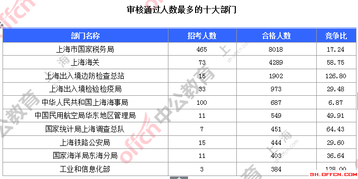 為幫助廣大考生更清晰的了解今日?qǐng)?bào)名情況,上海中公網(wǎng)校整理了審核通過(guò)人數(shù)前十位的部門以及競(jìng)爭(zhēng)比例最激烈的十大部門,供廣大考生參考: