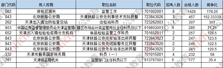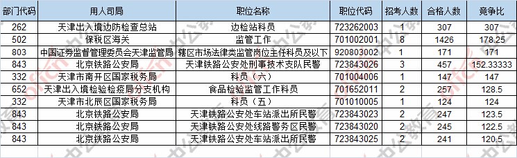 報(bào)名通過(guò)審核人數(shù)前十的職位主要集中在保稅區(qū)海關(guān)、北京鐵路公安局、天津出入境邊防檢查總站,具體信息如下:
