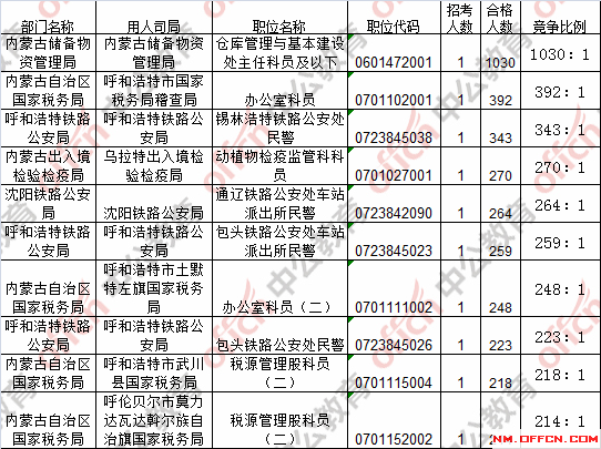 報(bào)名通過(guò)審核人數(shù)前十的職位主要集中在內(nèi)蒙古儲(chǔ)備物資管理局、內(nèi)蒙古土默特右旗國(guó)家稅務(wù)局、內(nèi)蒙古固陽(yáng)縣國(guó)家稅務(wù)局等部門,具體信息如下: