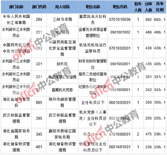 截至10月23日16時,據(jù)湖北中公網(wǎng)校統(tǒng)計,2017國家公務員考試報名結(jié)束倒數(shù)第2天,招錄職位中工作地點在湖北的職位通過審核總?cè)藬?shù)為30769人,其中521個職位中仍有20個職位無人通過審核。競爭最激烈職位為三峽海事局基層執(zhí)法大隊科員一職,招錄1人,過審人數(shù)692人,競爭比例為692:1。2017國家公務員考試網(wǎng)上報名時間為2016年10月15日8:00至24日18:00,還沒有報名的同學建議盡快報名。
