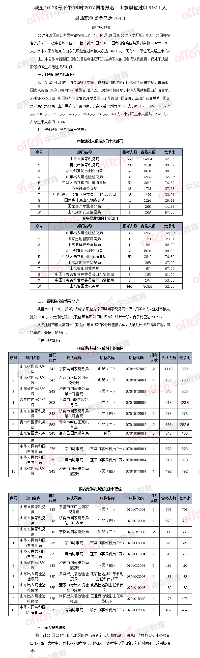 【截至23日16時】2017國考報名山東職位過審64611人 最熱職位競爭已達(dá)708:1