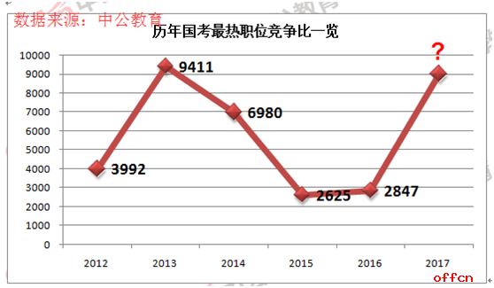 從下圖的歷年國(guó)考最熱職位競(jìng)爭(zhēng)比一覽圖中可清晰看出,從2012年至2016年,最熱職位峰出現(xiàn)在2013年國(guó)家統(tǒng)計(jì)局重慶調(diào)查總隊(duì)(1003722006)一職的9411:1,接近"萬(wàn)里挑一"。而今年最熱職位現(xiàn)在已達(dá)到7555:1,這是2013年后,出現(xiàn)的再一個(gè)"高峰",但因今年報(bào)名還有明日一天的時(shí)間,今年國(guó)考最熱職位究竟能爬上多高的"峰值",給我們帶來(lái)多大的"驚喜",讓我們?cè)诿魅?quot;拭目以待"。